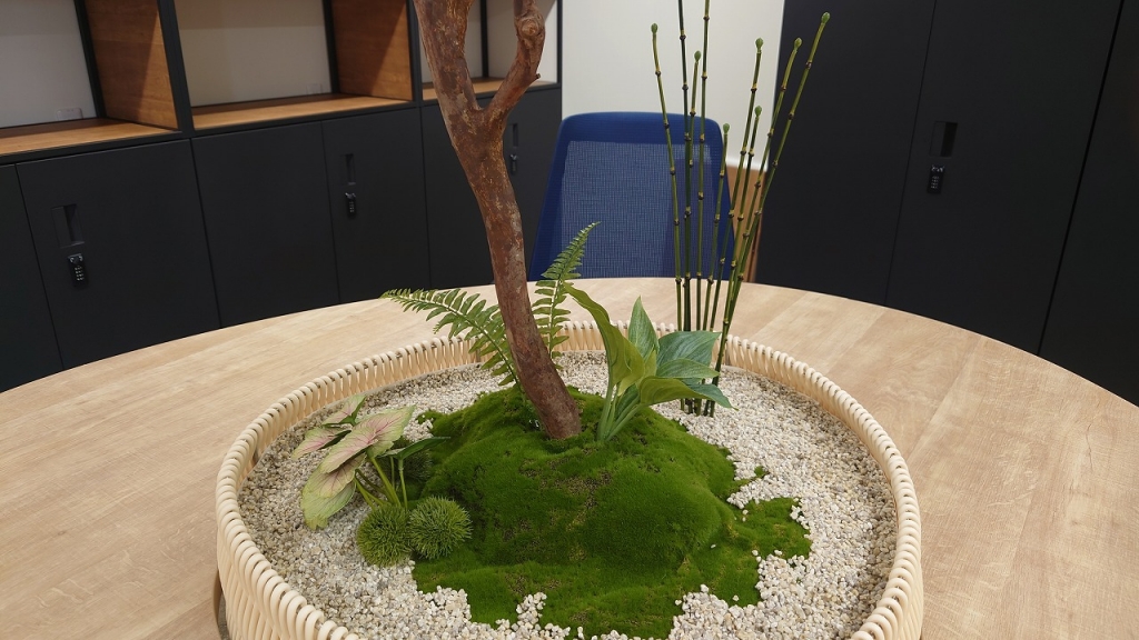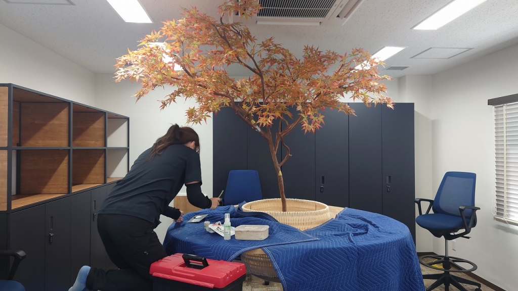 さしずめ長野上田オフィスづくり流家元のワタクシと、お客様とで、枝ぶりや葉の色を調整いたしました。